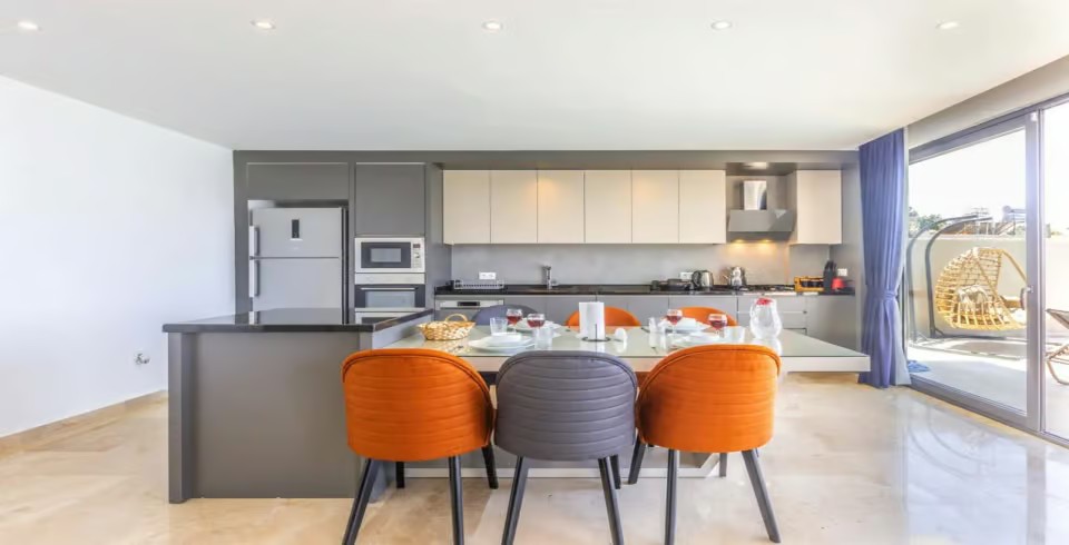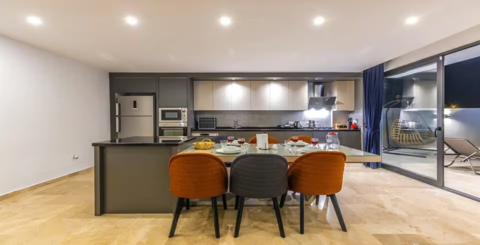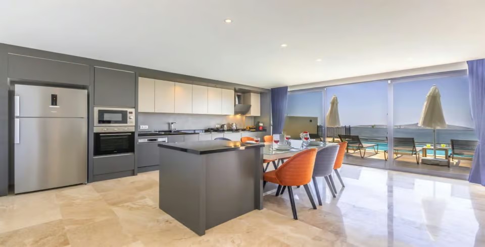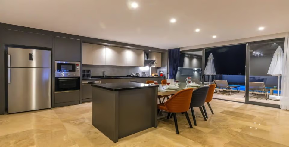 Mutfak : Amerikan açık mutfak ve salona sahip villamızın mutfağında buzdolabı, bulaşık makinası, ankastre ocak, fırın, mikrodalga, 4'lü ankastre ocak, kettle, çamaşır makinası, yemek masası ve temel mutfak araç ve gereçleri bulunmaktadır.