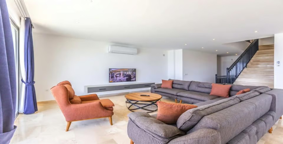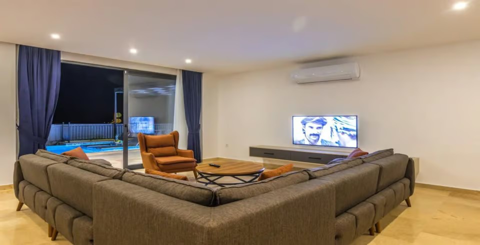Salon : Kiralık villamızın salonunda oturma grubu, TV, uydu, internet, DVD, sehpa bulunmaktadır.