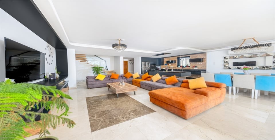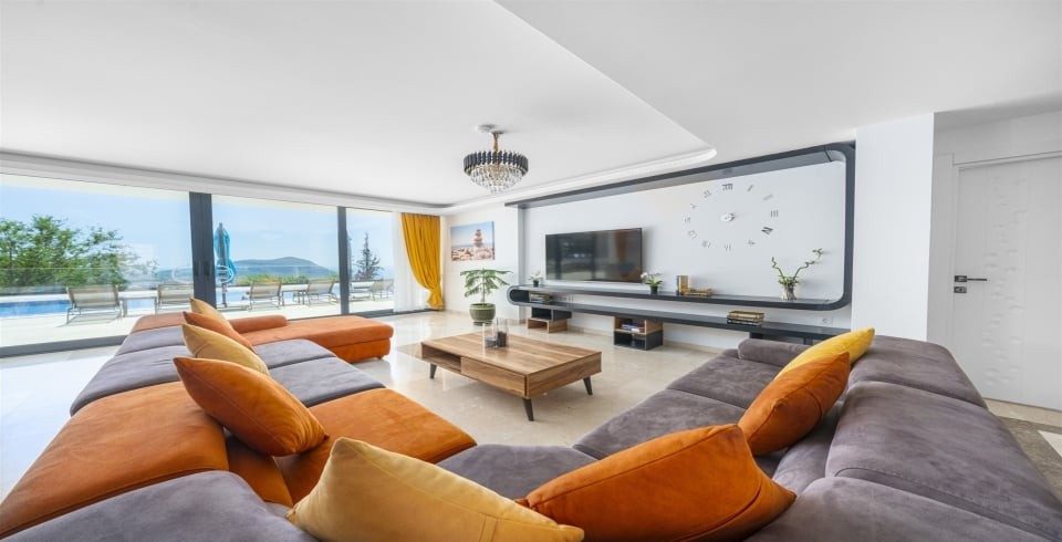 Salon : Geniş, ferah, modern tasarlanmış bir salon ve salonumuzda oturma grubu,  TV, DVD, TV ünitesi ve ses sistemi, muhteşem deniz manzarasına sahip olan salonumuzdan havuz başına çıkış bulunmaktadır.