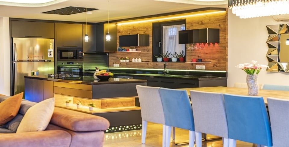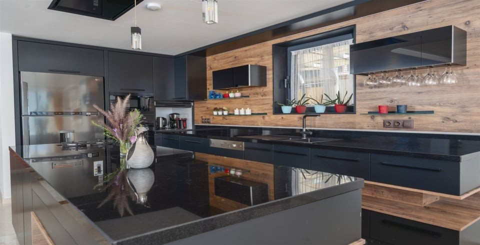 Mutfak : Amerikan ve Ankastre mutfak, Ekmek kızartma makinesi, Elektrikli su ısıtıcısı, 10 kişilik masa ve sandalyeler, Buzdolabı, çamaşır makinası, mutfak araç ve gereçlerini bulunmaktadır.