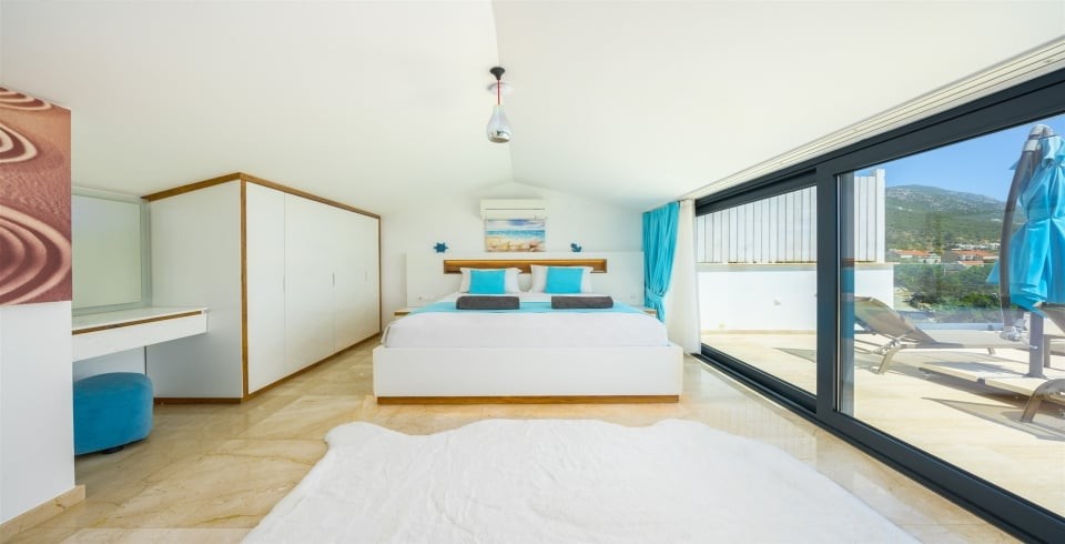 4. Yatak Odası : Çift kişilik yatak, komodin, klima, abajur, masa ve sandalye, deniz manzaralı balkon, jakuzi, banyo ve lavabo bulunmaktadır.