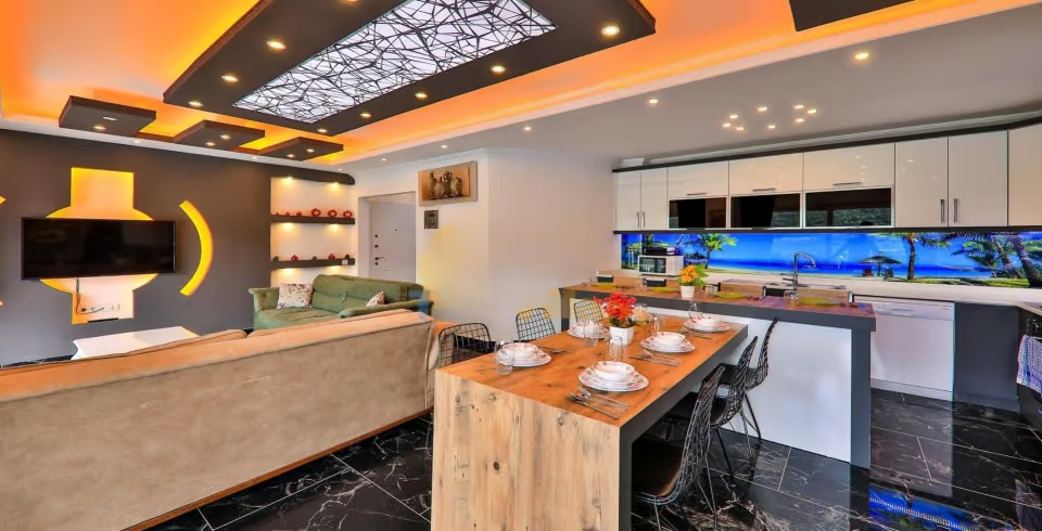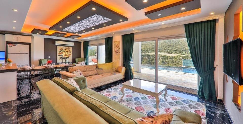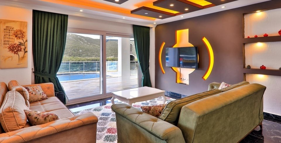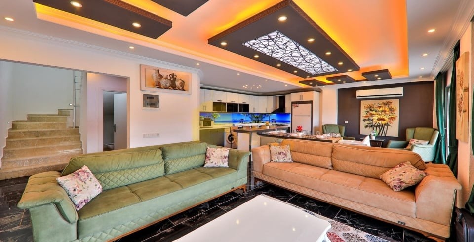 Salon : Villamızın iç dizaynı da son modaya uygun olarak modern bir şekilde tasarlanmıştır. Çeşitli dekoratif eşyalarla süslediğimiz salonumuz havuzlu bahçeye açılıyor. Villa’nın salonunda oturma grubu, tv, internet, klima, yemek masası, sehpa bulunmaktadır.