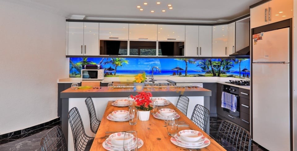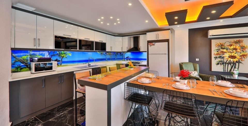 Mutfak : Modern Amerika mutfağımızda 4 kişilik yemek masası, buzdolabı, çamaşır makinesi, 4’lü ocak, tost makinesi, elektrikli su ısıtıcısı, çatal-bıçak takımı, tencere-tava takımı, bulaşık makinesi bulunmaktadır.
