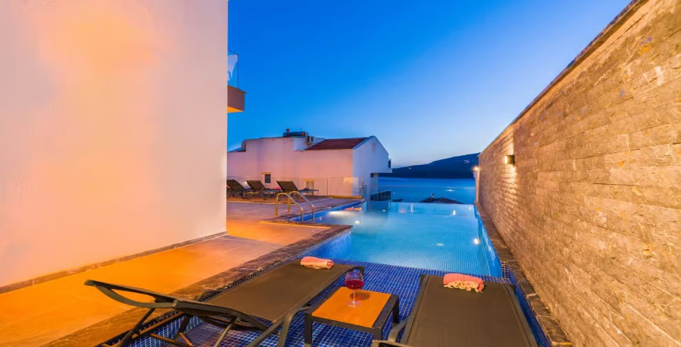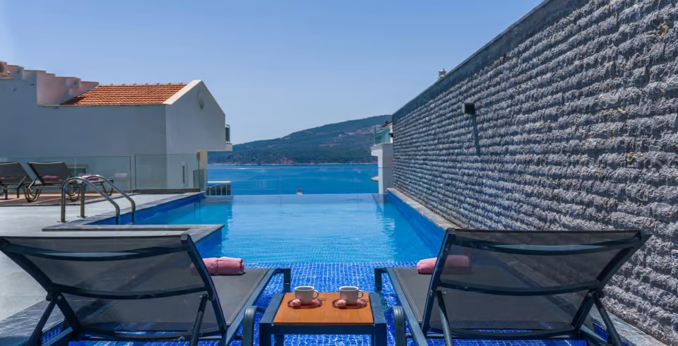 Havuz ve Bahçe :  Deniz Manzaralı, Güneşlenme, Özel Havuz, 6 kişilik masa sandalye,6 tane şezlong, Güneşlenme şemsiyesi