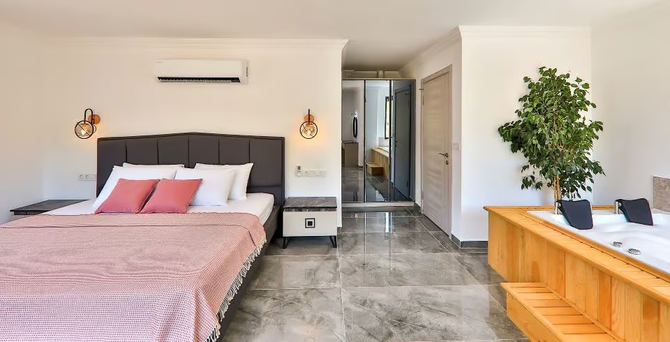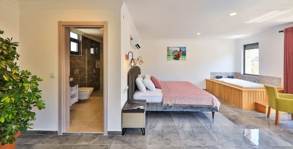 1: Yatak Odası: Çift kişilik yatak, klima, jakuzi, komodin, elbise dolabı, makyaj masası, TV banyo ve tuvalet bulunmaktadır.