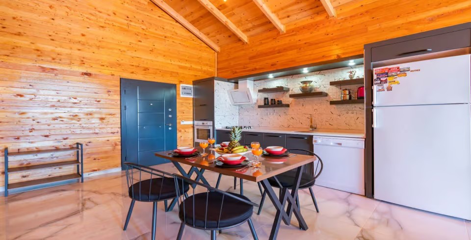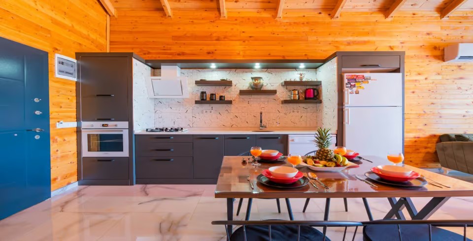 Mutfak :  Buzdolabı, bulaşık makinası, çamaşır makinası, kettle, kahve makinası, fırın, mikrodalga fırın, ocak, yemek masası, yemek takımları, tencere tava takımları, çaydanlık bulunmaktadır.