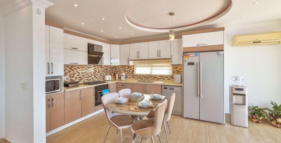 Mutfak : Modern Amerikan mutfak içerisinde 6 kişilik yemek masası, mama sandalyesi, buzdolabı, bulaşık makinası, fırın, ocak, mikrodalga fırın, tost makinası, yemek masası, yemek takımları, çatal ve bıçak takımları, tencere ve tava takımları, bardaklar bulunmaktadır.