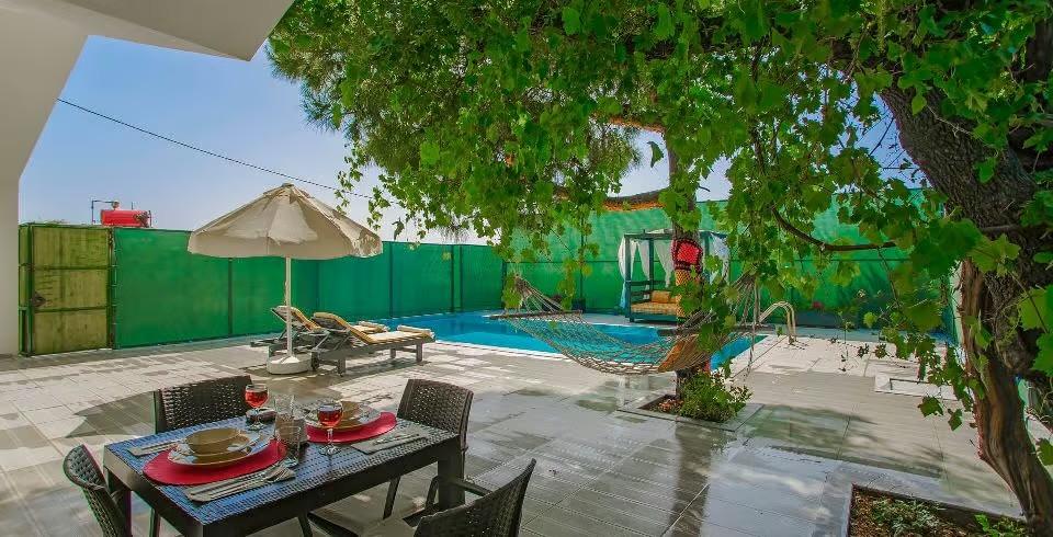Bahçe : Villamızın bahçesinde özel yüzme havuzu, güneşlenmeniz için 2 adet şezlong, güneşlenme terası, 4 kişilik masa, oturma grubu, mangal keyfiniz için barbekü, güneş şemsiyesi bulunmaktadır.