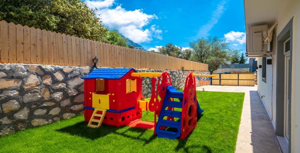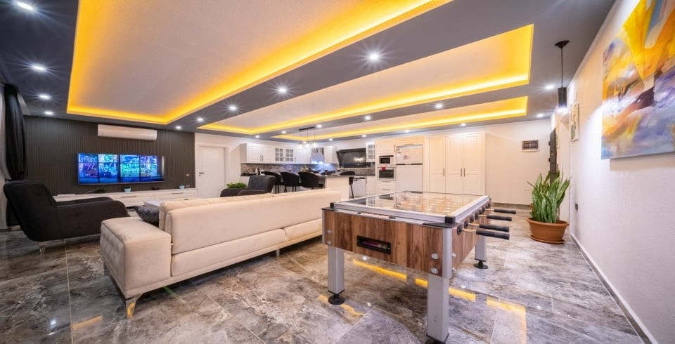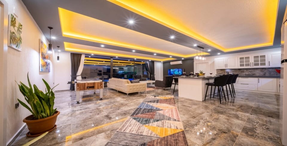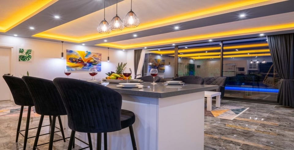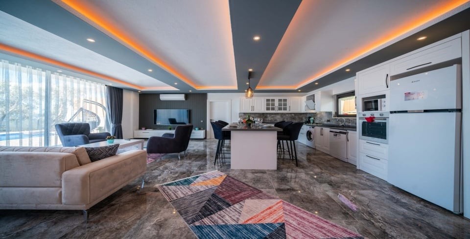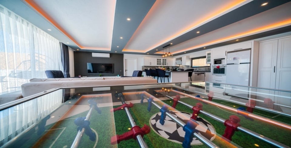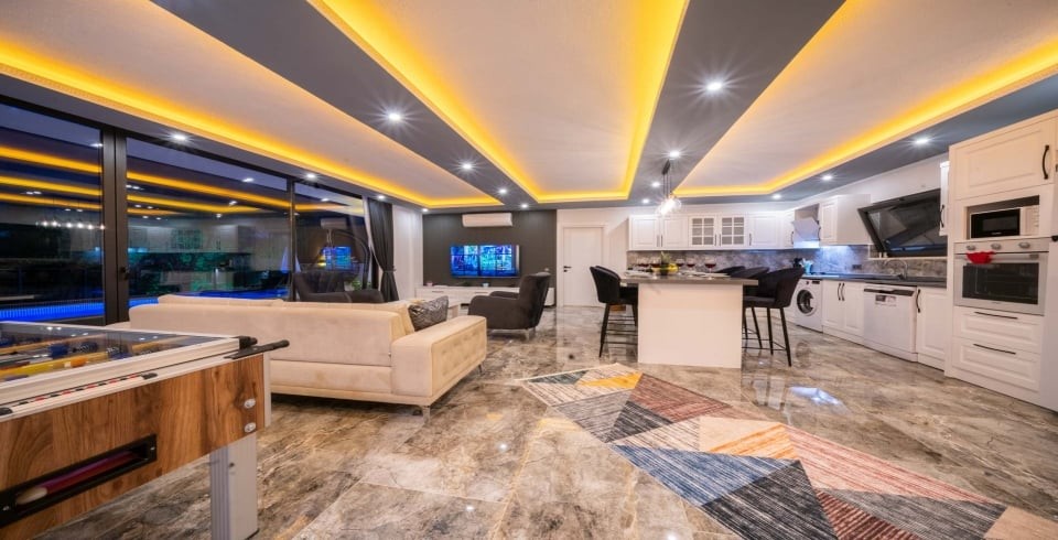 İç mekânda ferah salon ve açık mutfak düzeni ile cam sürgülü kapılar havuz terasına bağlanır; bu sayede iç ve dış mekan arasındaki geçiş akıcıdır. Villada yer alan mutfak, fırın, ocak, buzdolabı ve temel ekipmanlarla tam donanımlıdır. Dış alanda özel havuz, şezlonglar, gölgeli oturma alanı, masa tenisi, langırt ve çocuk oyun parkı gibi etkinlik imkânları sunulur. Havuz ve bahçe alanı dış görüşe kapalı olacak şekilde düzenlenmiş olup mahremiyeti korur.