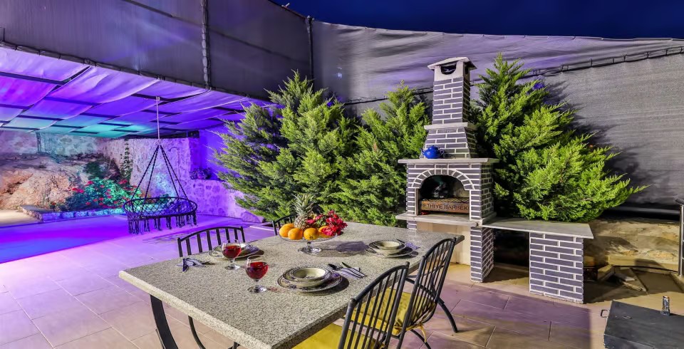 Bahçe : Bahçe içerisinde özel yüzme havuzu, 4 adet şezlong, 4 kişilik yemek masası, barbekü, güneş şemsiyesi bulunmaktadır