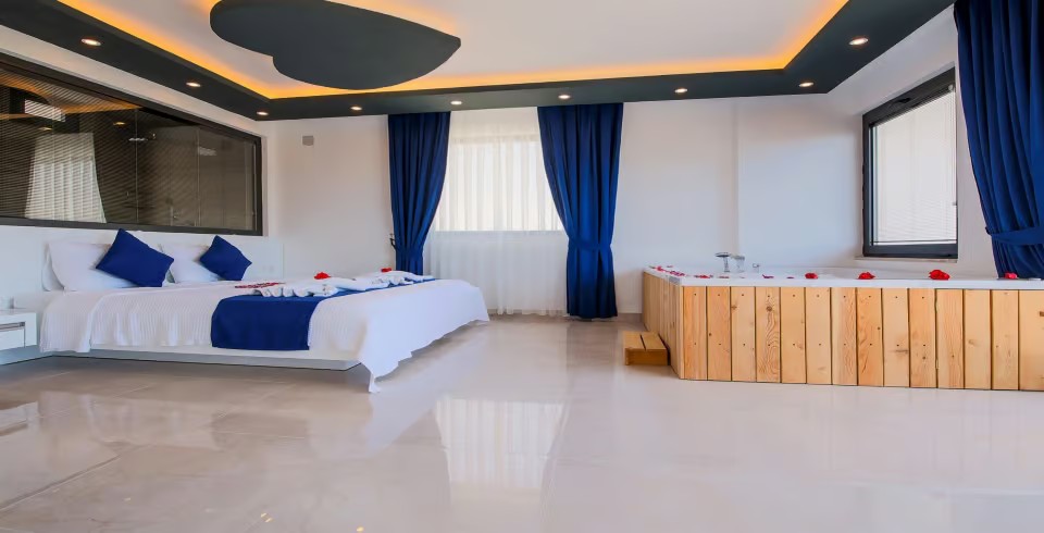 1. Yatak Odası : Çift kişilik yatak, klima, komodin, elbise dolabı, makyaj masası, banyo ve lavabo, jakuzi bulunmaktadır.