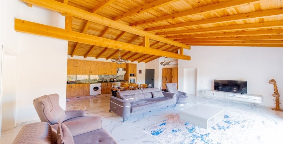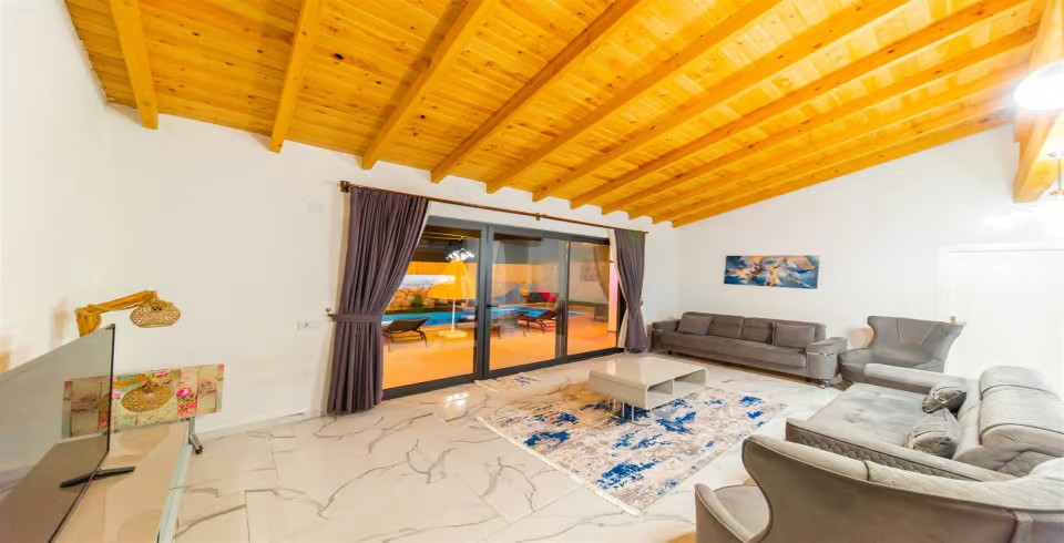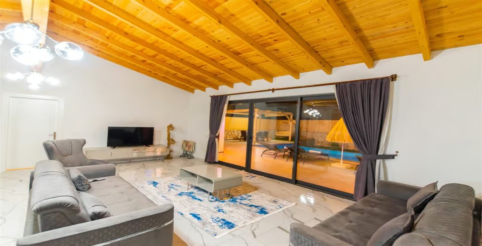 Salon : 2023 yılı içerisinde sitemize dahil olan villamızın iç dizaynı da son modaya uygun olarak modern bir şekilde tasarlanmıştır. Çeşitli dekoratif eşyalarla süslediğimiz salonumuz havuzlu bahçeye açılıyor. Villa salonunda oturma grubu, TV, internet, klima, yemek masası, sehpa bulunmaktadır.