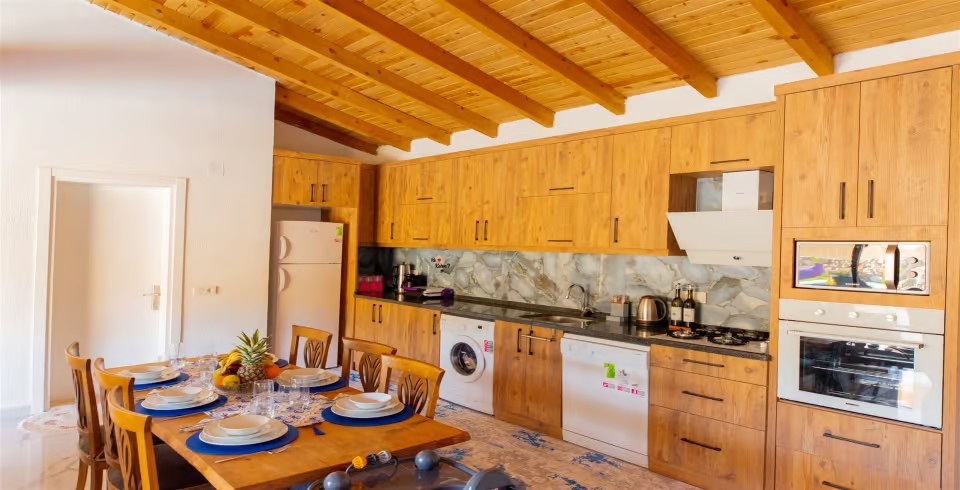 Mutfak : Modern Amerika mutfağımızda 4 kişilik yemek masası, buzdolabı, çamaşır makinesi, mikrodalga fırın, 4’lü ocak, tost makinesi, elektrikli su ısıtıcısı, çatal-bıçak takımı, tencere-tava takımı, bulaşık makinesi bulunmaktadır.
