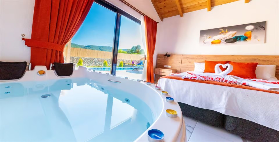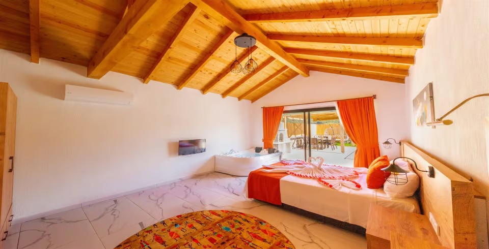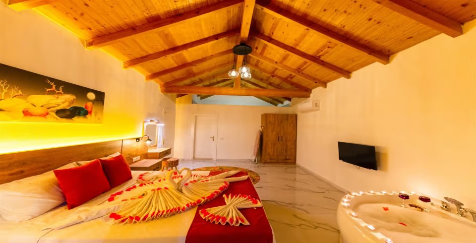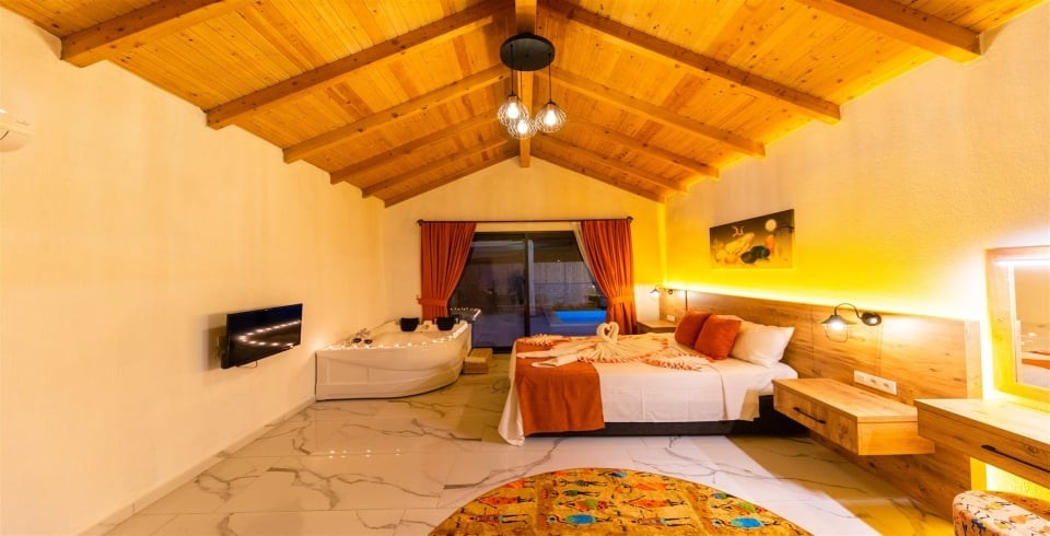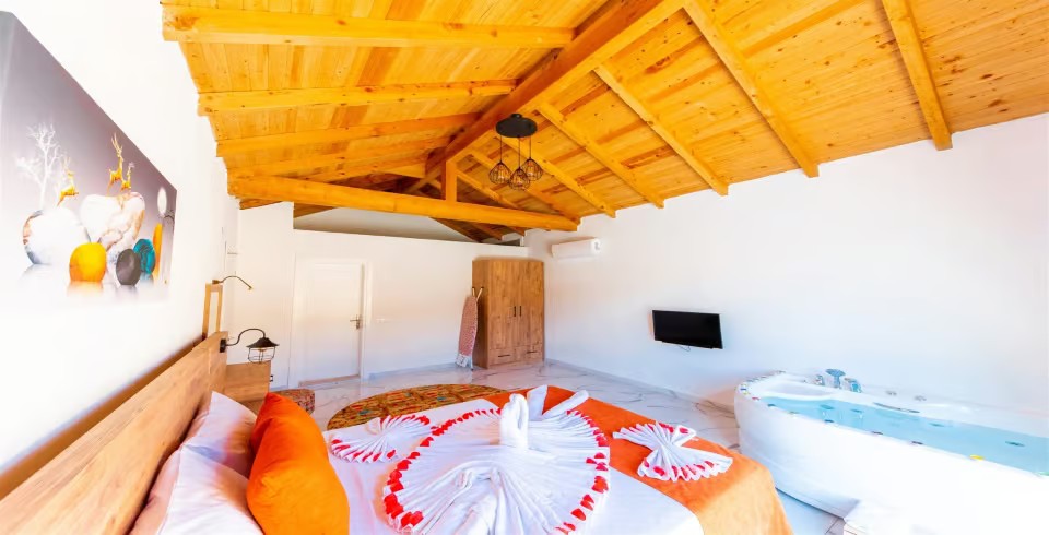 1. Yatak Odası : Çift kişilik yatak, klima, komodin, jakuzi, TV, makyaj masası, banyo ve lavabo bulunmaktadır.