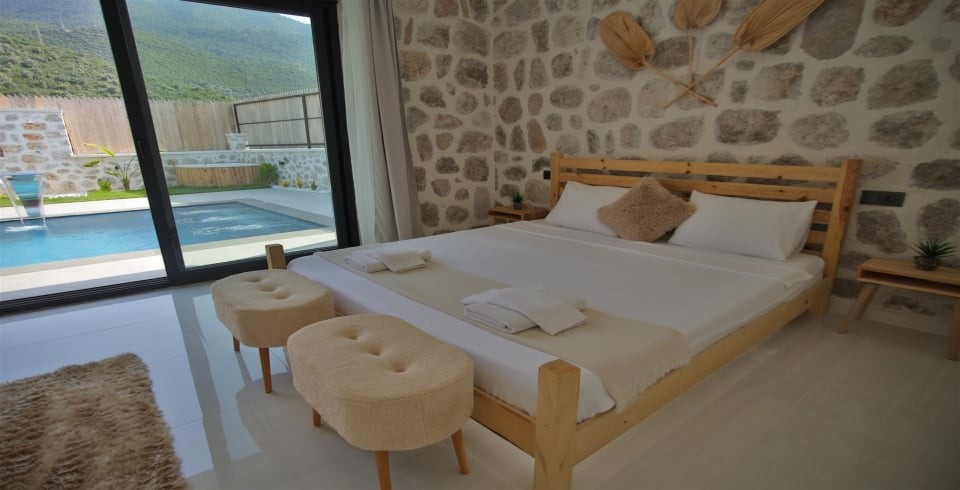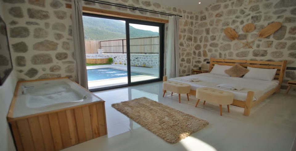 1. Yatak Odası: Çift kişilik yatak, klima, jakuzi, komodin, elbise dolabı, makyaj masası, banyo ve tuvalet bulunmaktadır.