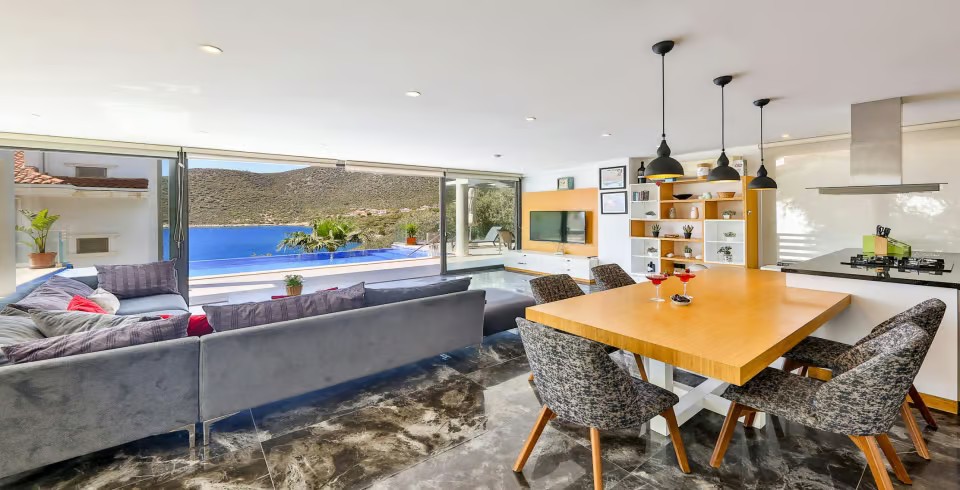 Modern açık mutfak salona sahip kiralık yazlık villamız tüm villa tatil severlerin hizmetindedir. Kalamar plajına yürüme mesafesinde bulunan villamızın ayrıca su sporları, dalış ve su kayağı gibi etkinliklere de çok yakın mesafede bulunmaktadır.