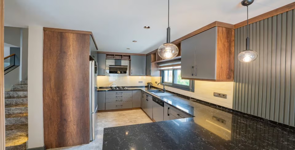 Mutfak : Modern Amerikan mutfak içerisinde  yemek masası, buzdolabı, bulaşık makinası, fırın, ocak, mikrodalga fırın, yemek takımları, çatal ve bıçak takımları, tencere ve tava takımları, bardaklar bulunmaktadır.