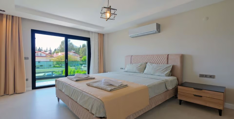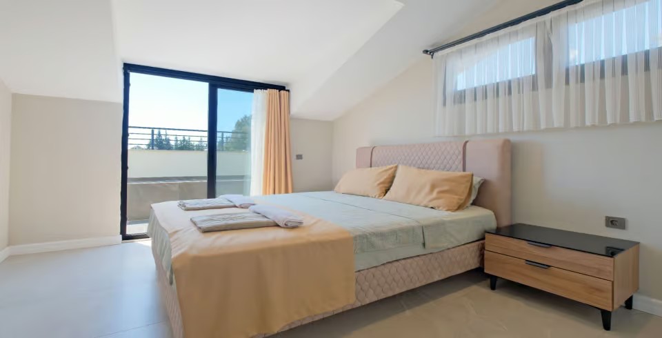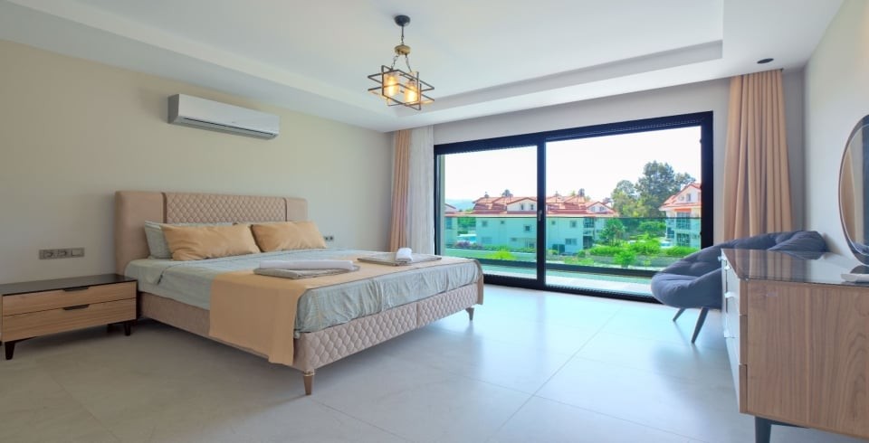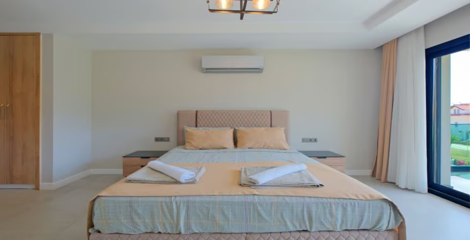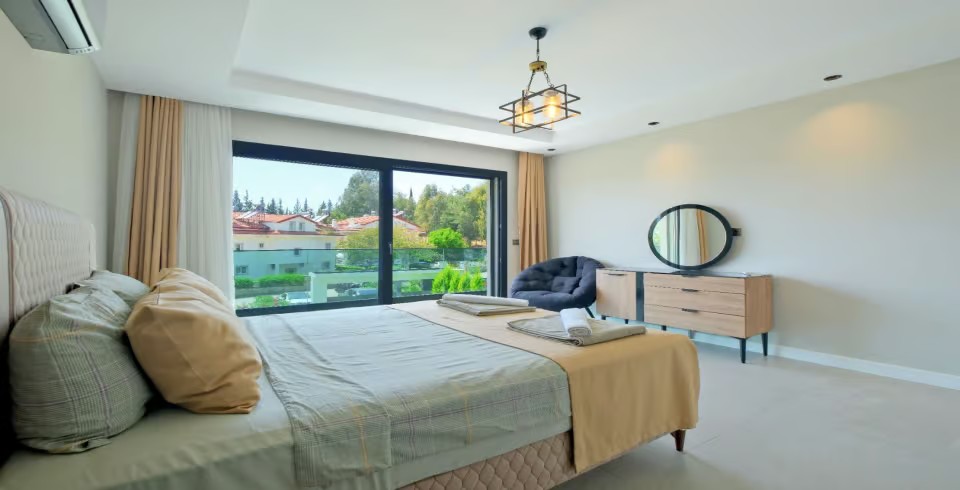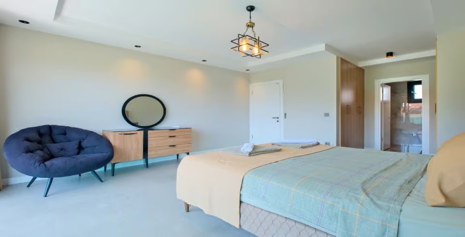 4. Yatak Odası : 1 adet çift kişilik yatak, klima, komodin, elbise dolabı, makyaj masası, banyo ve tuvalet  bulunmaktadır.