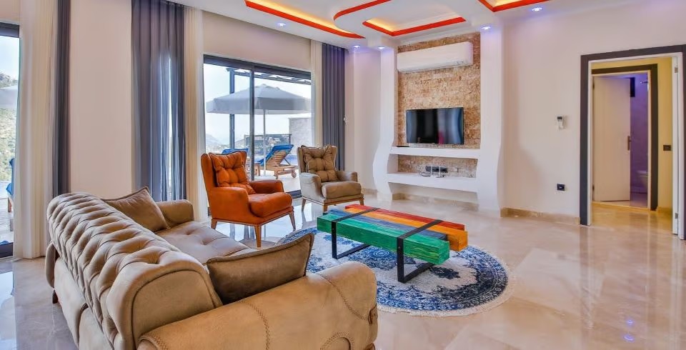 Salon : Havuz terasına direkt çıkışı olan çeşitli dekorasyonlarla süslediğimiz salonumuzda kendi evinizmiş gibi hissedeceksiniz. Basık otel odalarından sıkıldıysanız doğa manzaralı korunaklı villamızı tercih edeceğiniz için pişman olmayacaksınız. Geniş salonumuzda oturma grubu, klima, LCD televizyon, sehpa, uydu alıcı bulunmaktadır.