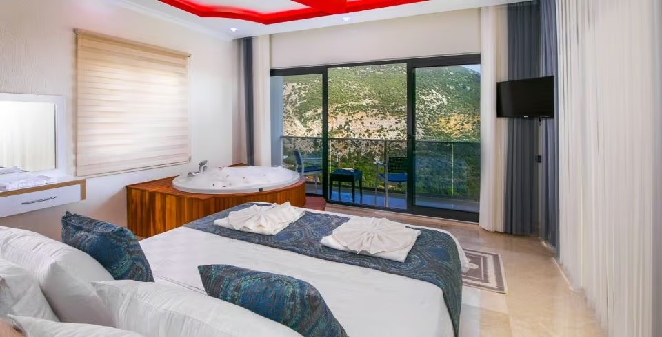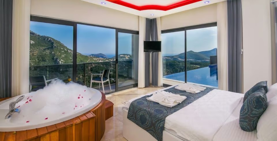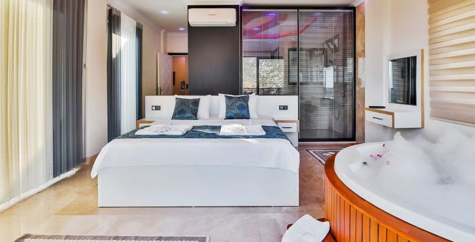 1. Yatak Odası : Birinci yatak odamızda 1 adet çift kişilik yatak, klima, elbise dolabı, makyaj masası, komodin, elbise dolabı, banyo ve lavabo bulunmaktadır. Doğa ile iç içe olup aynı zamanda da muhafazakar villamızda manzaranın keyfini çıkarabileceğiniz balkon ve günün yorgunluğunu atabileceğiniz jakuzi bulunmaktadır.