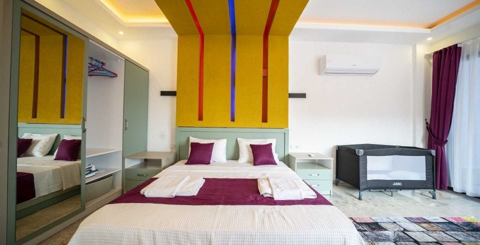 1. Yatak Odası : 1 Çift Kişilik Yatak, Klima, Elbise Dolabı, Jakuzi, Komodin, Makyaj Masası, banyo ve tuvalet bulunmaktadır.