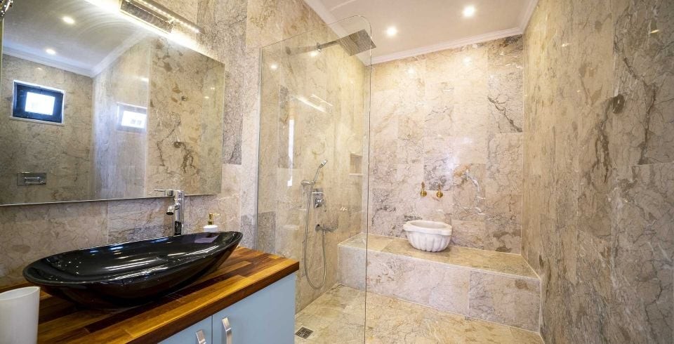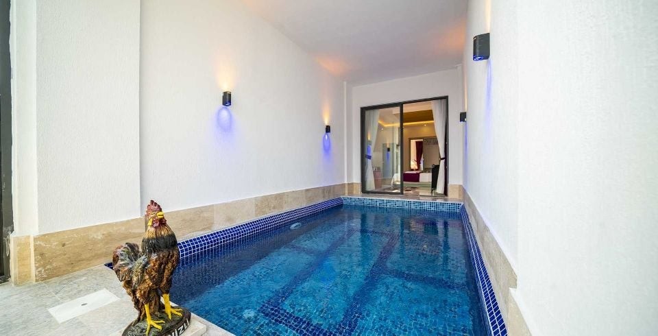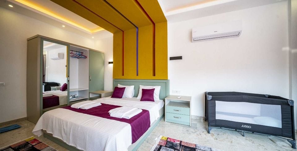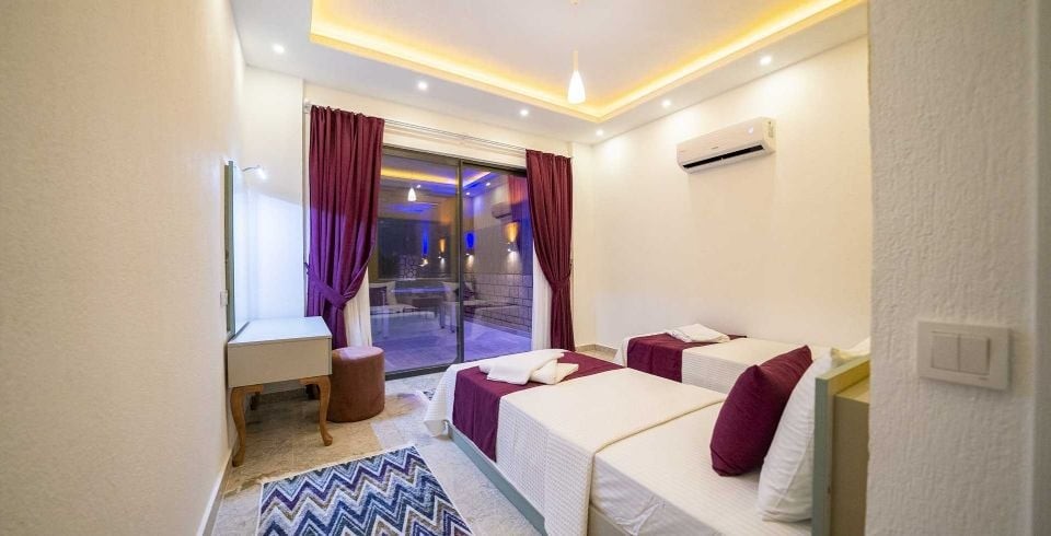 Villada iki adet yatak odası ve iki banyo bulunur. Ebeveyn yatak odasında konforlu bir çift kişilik yatak, jakuzi, televizyon, klima, banyo ve ısıtmalı iç havuz yer alır. İkinci yatak odasında ise iki tek kişilik yatak, klima ve özel banyo mevcuttur. Ayrıca ebeveyn banyosunda yer alan iki adet hamam çeşmesi, misafirlere geleneksel Türk hamamı keyfi yaşatır. Salon kısmında tam donanımlı modern mutfak, oturma alanı, klima ve televizyon bulunur.