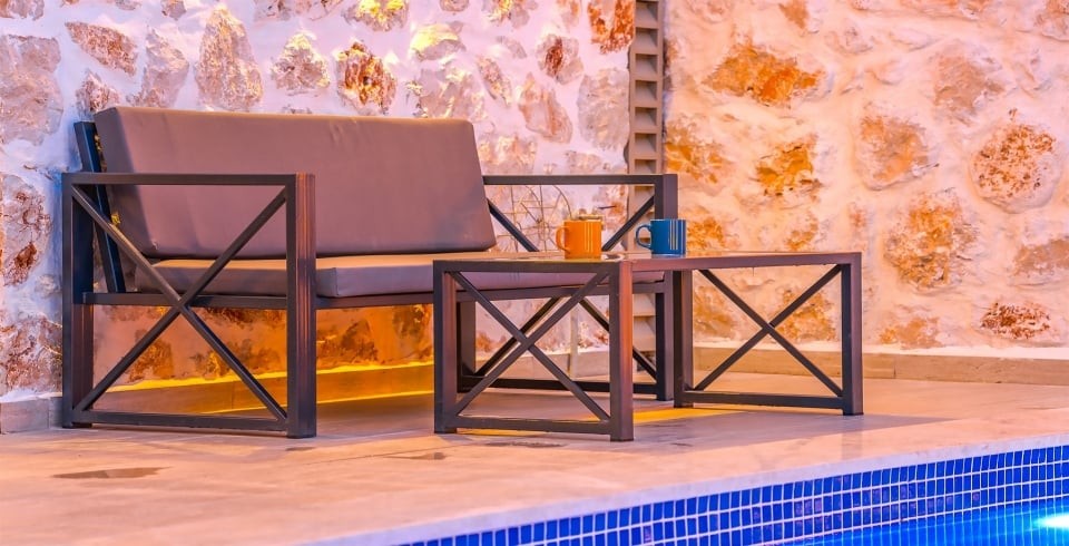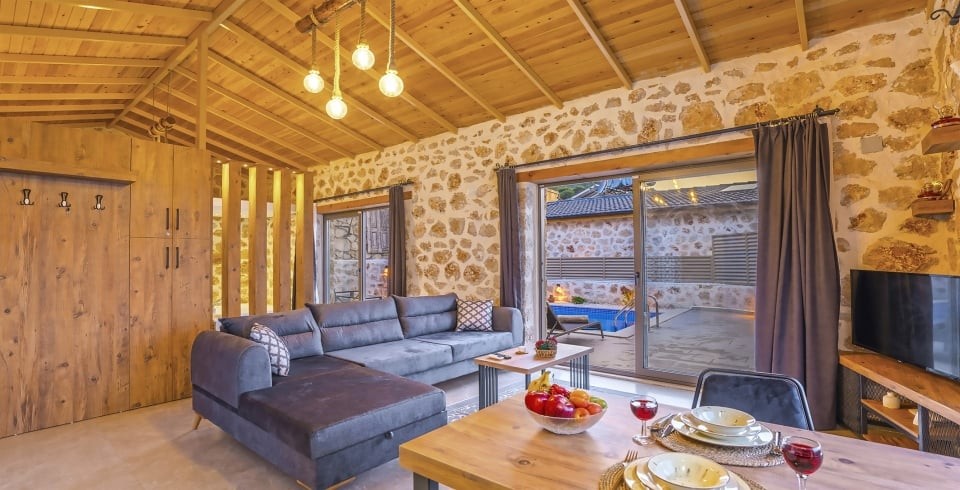Salon : Modern dizayn edilmiş yüksek tavanlı villamızın salonunda konforlu oturma grubu, TV, uydu alıcısı, internet, yemek masası ve klima yer almaktadır. Salondan havuz terasına geçiş vardır.