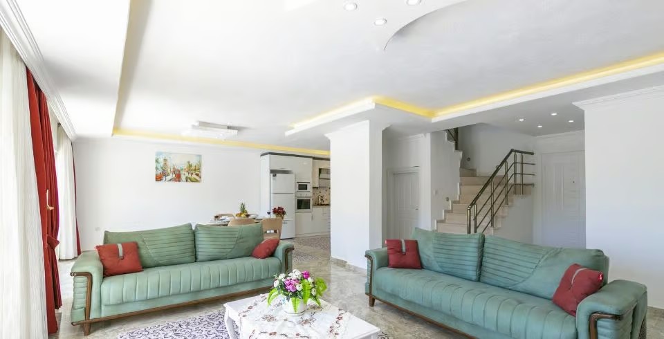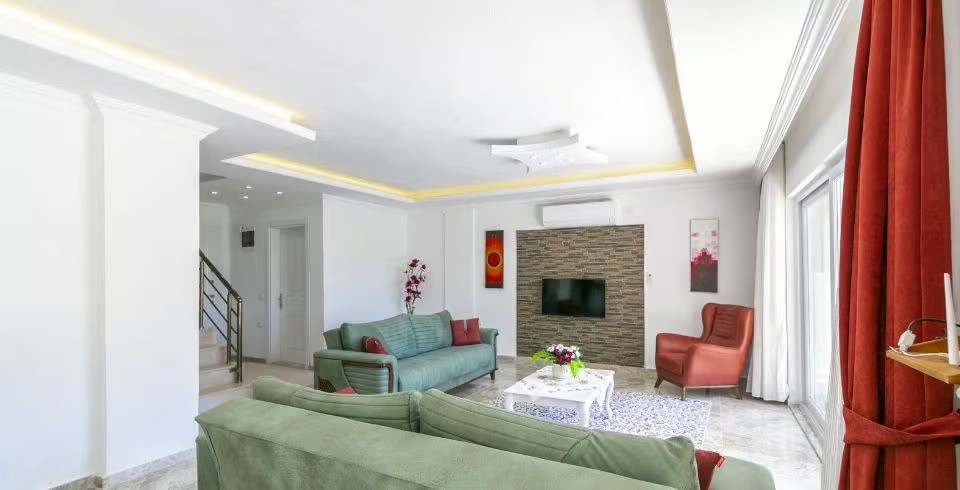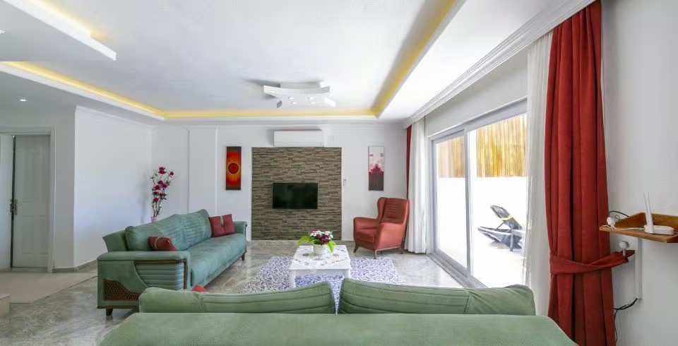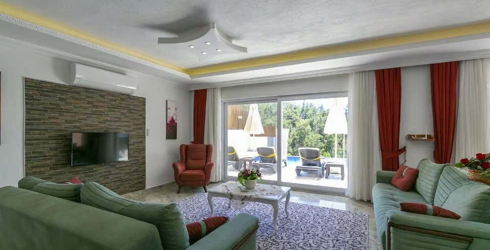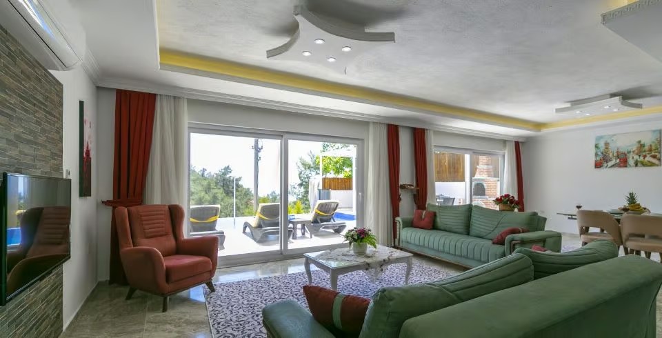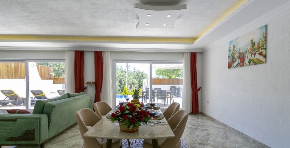 Salon: Villa salonunda konforlu oturma grubu, klima, TV, internet, uydu alıcı, yemek masası, sehpa bulunmaktadır.