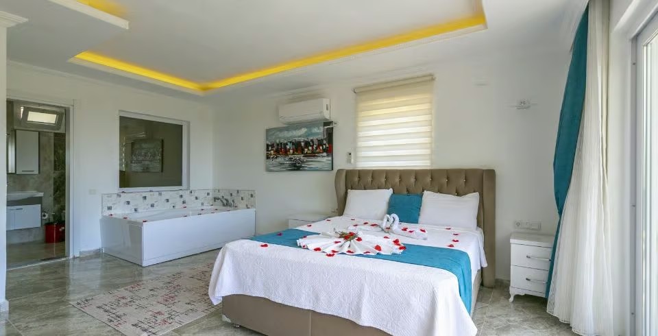 1. Yatak Odası: Çift kişilik yatak, klima, jakuzi, komodin, elbise dolabı, makyaj masası, banyo ve tuvalet bulunmaktadır.