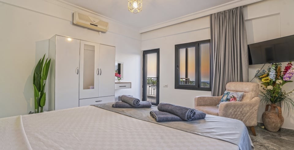 1.Yatak Odası: 1 adet çift kişilik yatak, elbise dolabı, komodin, klima, makyaj masası, TV bulunmaktadır.