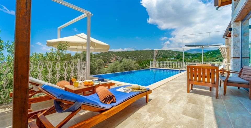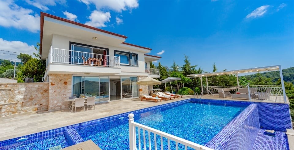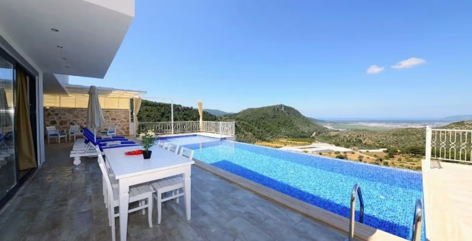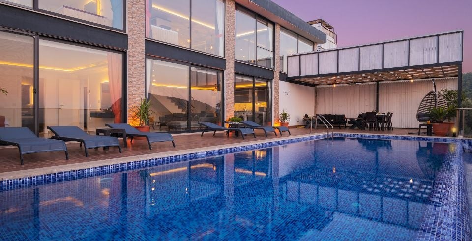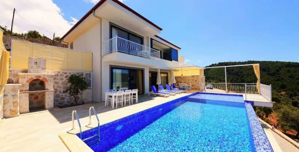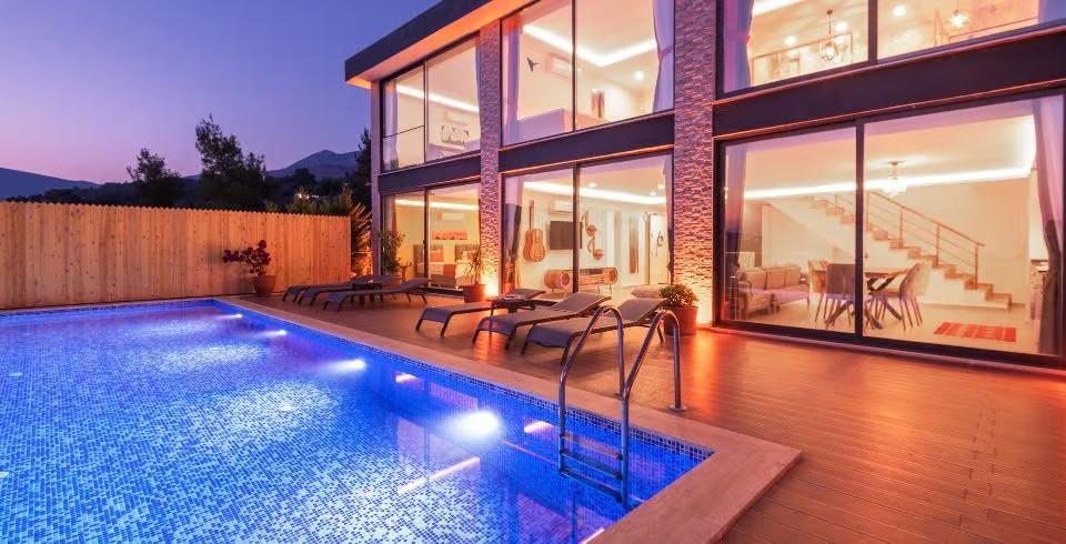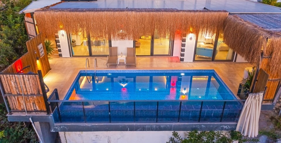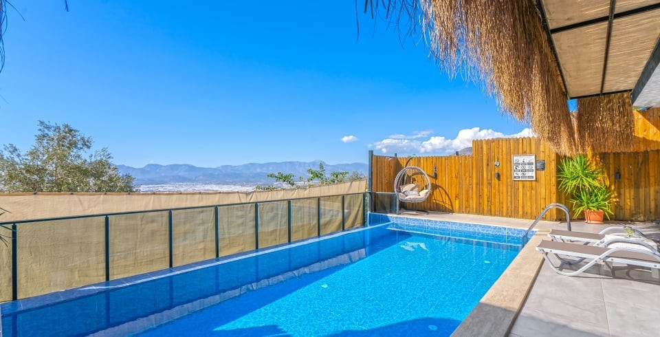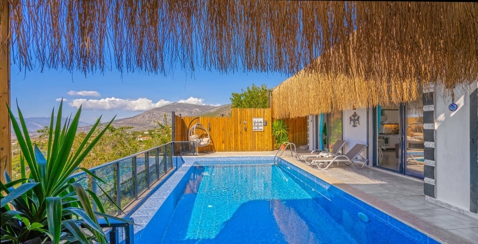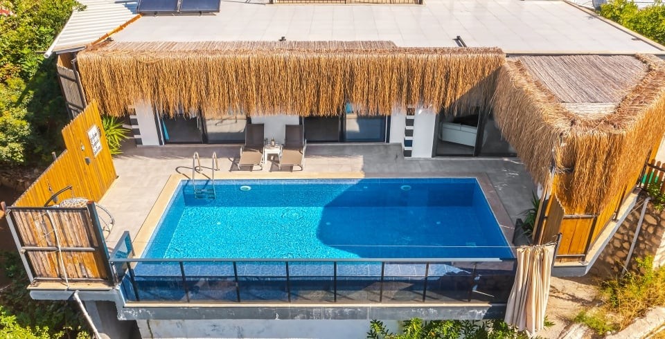 Korunaklı özel yüzme havuzu, havuz terası ve şezlonglarla donatılmış güneşlenme alanı, mahremiyet odaklı konaklama isteyenler için büyük avantaj sağlar. Tam donanımlı mutfak; ankastre ocak, fırın, buzdolabı, mikrodalga ve gerekli mutfak gereçleri ile yemek hazırlama imkânı sunar. Oturma alanı, TV ve klima gibi konfor öğeleriyle donatılmıştır.