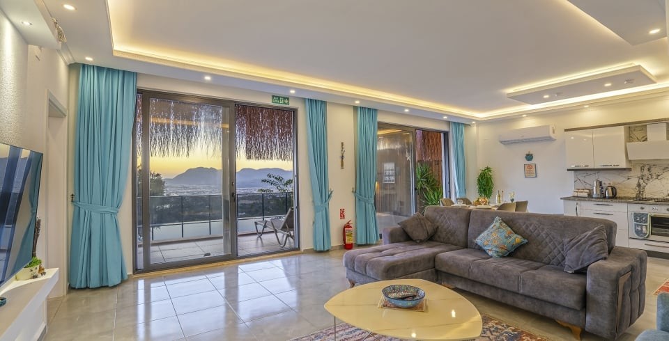 Salon: Özenle döşenmiş salon, modern koltuklar, 2 kişilik yemek masası, LCD TV ve klima bulunmaktadır.