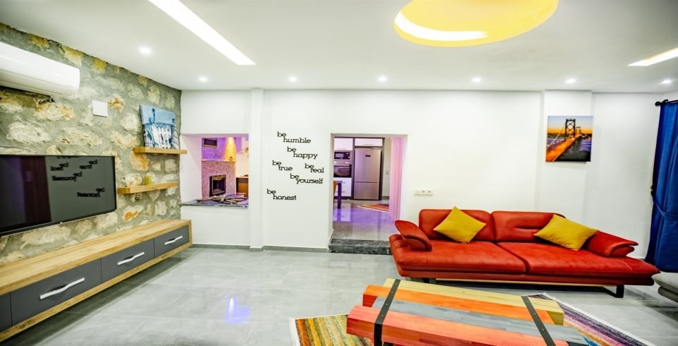 Salon : Havuz terasına direkt çıkışı olan salonumuzda LCD televizyon, uydu alıcı, modem, oturma grubu, yemek masası ve sandalyeler bulunmaktadır.