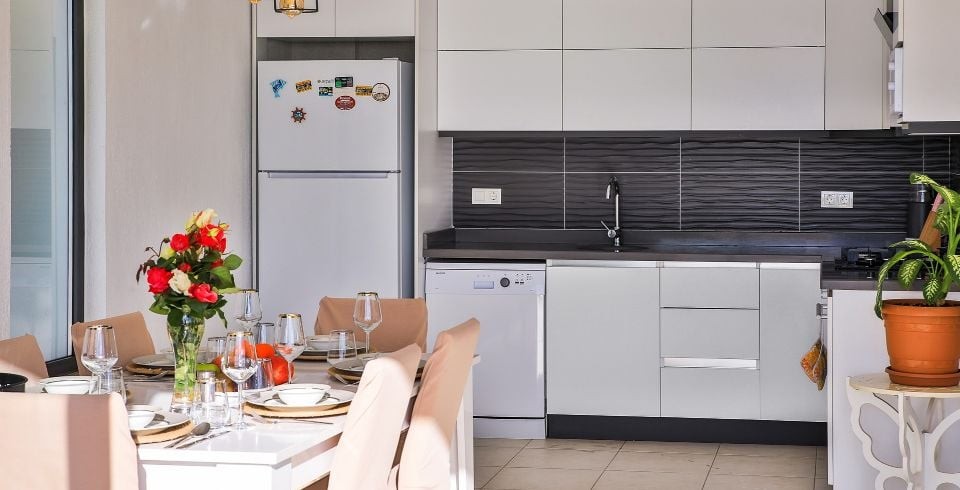 Mutfak : Villamızın geniş Amerikan mutfağı ile sizlere kendi evinizin mutfağı gibi hissettirecek. Ayrıca mutfakta klima, bulaşık makinası, buzdolabı, çamaşır makinası, mikrodalga fırın, tost makinası, ekmek kızartma, su ısıtıcısı, fırın, 4`lü ocak seti ve 6 kişilik geniş yemek masası ile tava tencere vb. mutfak araç gereçlerini kullanma fırsatını sizlere sunuyoruz.