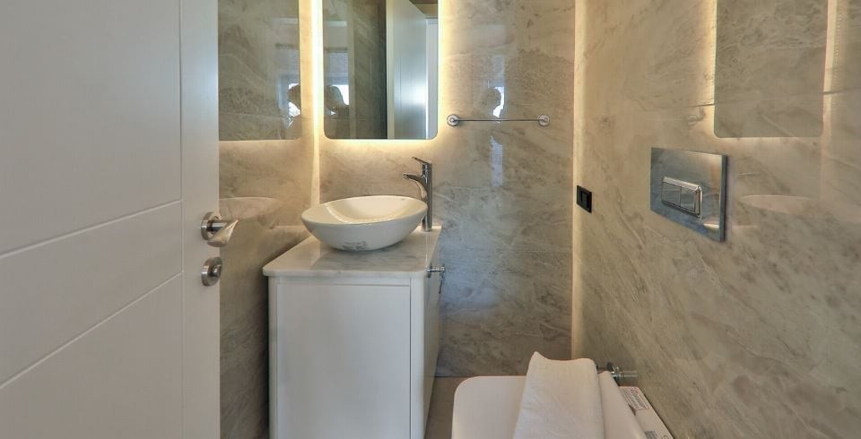1. Yatak Odası : 1 adet çift kişilik yatak, klima, komodin, elbise dolabı, makyaj masası, ısıtma havuzu, sauna balkon, banyo ve tuvalet bulunmaktadır.