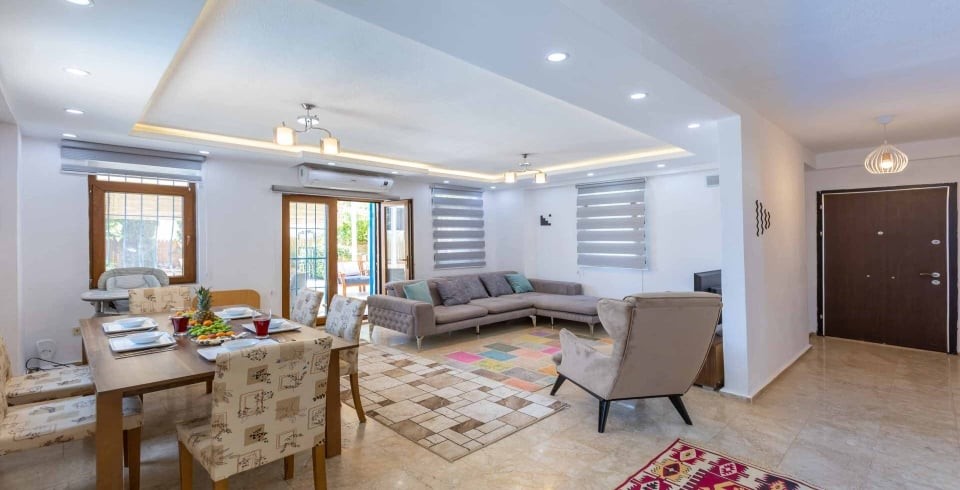 Salon : Villa EA'nın salonunda sizi şık bir oturma grubu ile klima, televizyon, internet, uydu, koltuk, sehpa tuvalet-banyo ile ferah bir salon bekliyor olacaktır. Havuz terasına çıkış yapılmaktadır.
