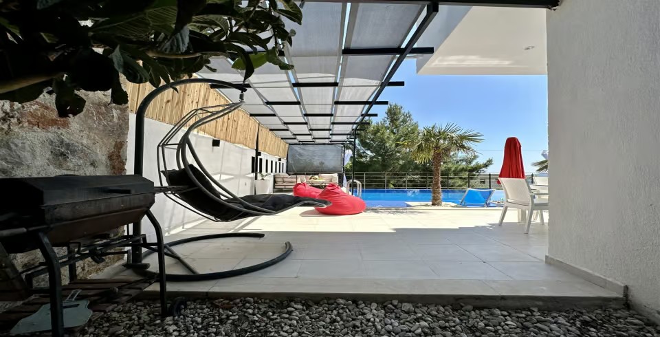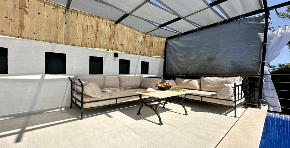Bahçe : Villamızın bahçesinde özel yüzme havuzu, güneşlenmeniz için şezlong, masa, mangal keyfiniz için barbekü, güneş şemsiyesi bulunmaktadır.