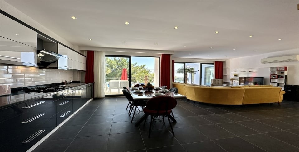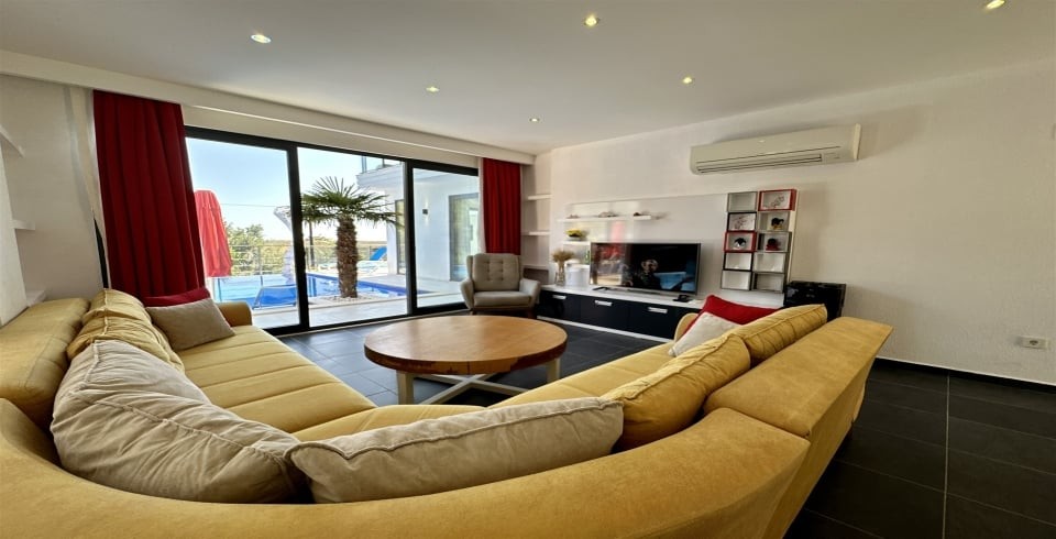 Salon : Villamızın salonunda sizi şık bir oturma grubu ile klima, yemek masası, TV, internet, uydu, koltuk, sehpa ile ferah bir salon bekliyor olacaktır. Havuz terasına çıkış buradan gerçekleşmektedir.