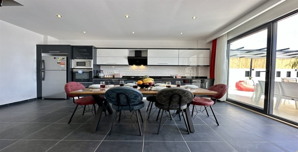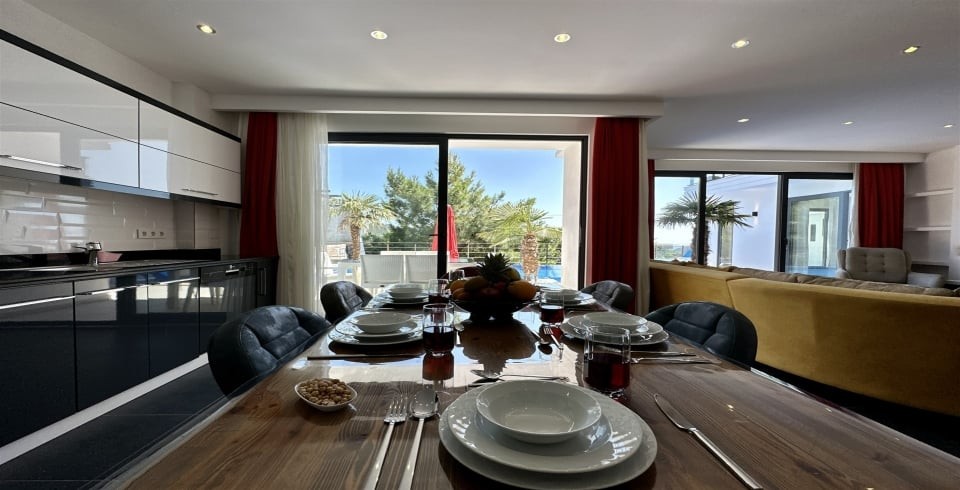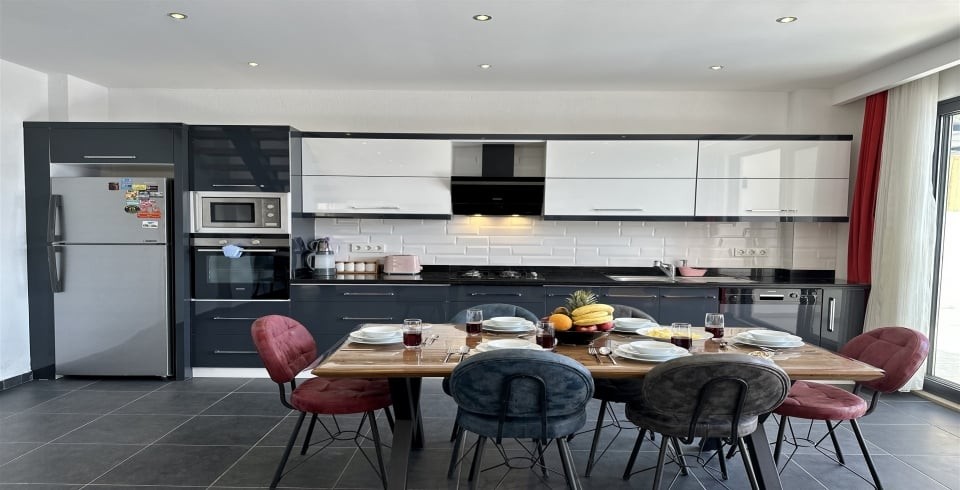 Mutfak : Villamızın geniş Amerikan mutfağı ile sizlere kendi evinizin mutfağı gibi hissettirecek. Ayrıca mutfakta bulaşık makinası, buzdolabı, çamaşır makinası, ekmek kızartma, su ısıtıcısı, fırın, 4`lü ocak seti ve geniş yemek masası ile mutfak araç gereçlerini kullanma fırsatını sizlere sunuyoruz.
