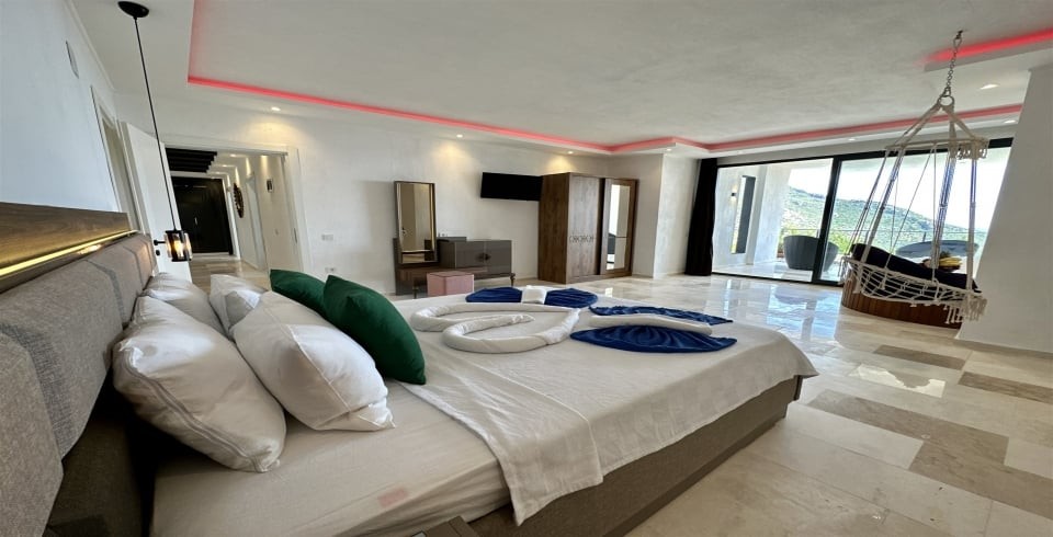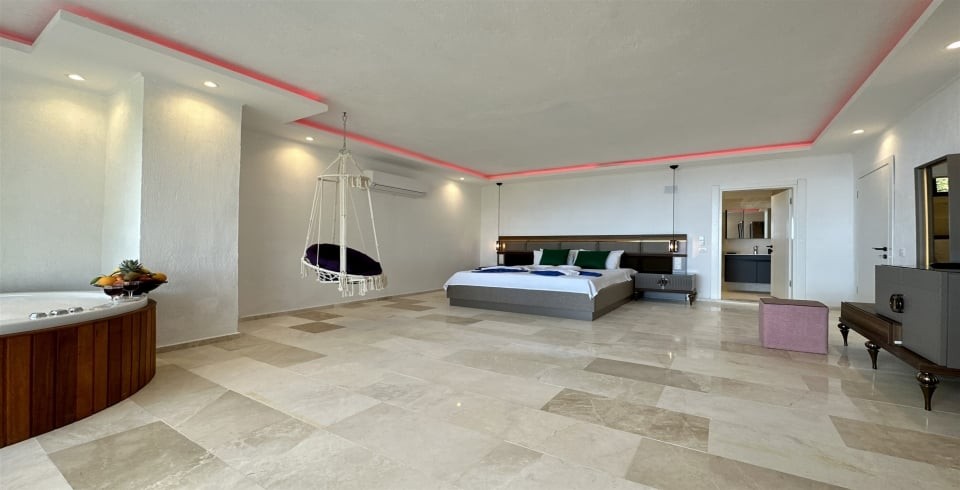 1. Yatak Odası : Çift kişilik yatak, klima, komodin, elbise dolabı, makyaj masası, jakuzi, banyo ve lavabo bulunmaktadır. Yatak odasından havuz terasına geçiş yapılmaktadır.