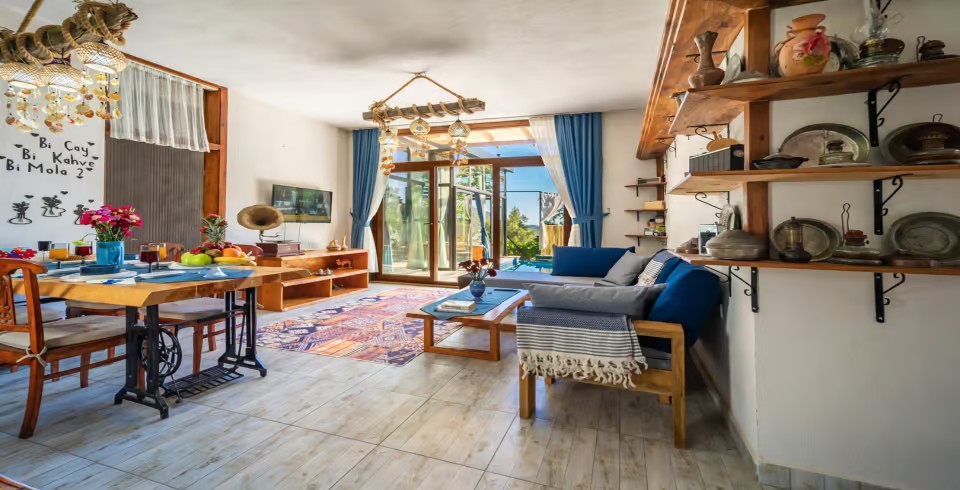 Salon: Modern oturma grubu, televizyon, klima, orta sehpa, yemek masası, sandalyeler ve havuz terasına çıkış bulunmaktadır.