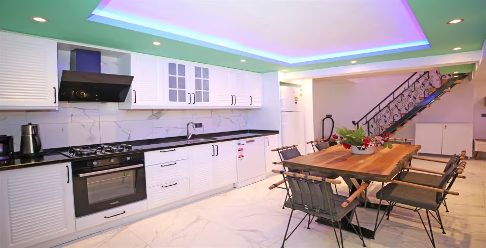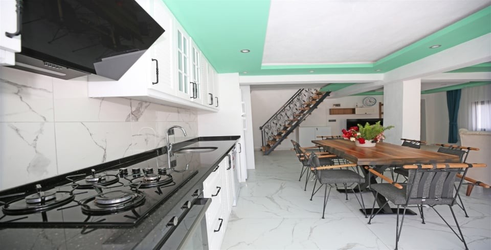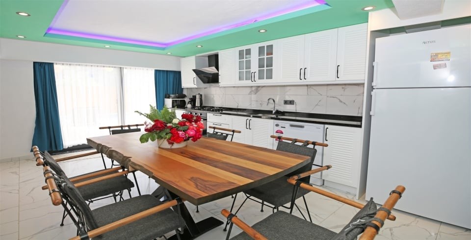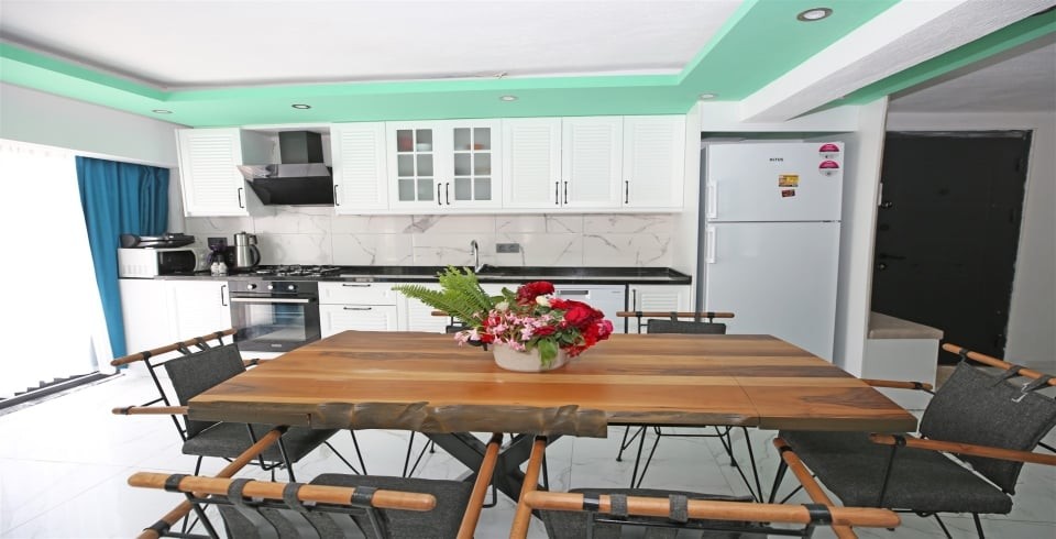 Mutfak :Buzdolabı, çamaşır makinesi, mikrodalga fırın, 4’lü ocak, tost makinesi, elektrikli su ısıtıcısı, çatal-bıçak takımı, tencere-tava takımı, bulaşık makinesi bulunmaktadır.