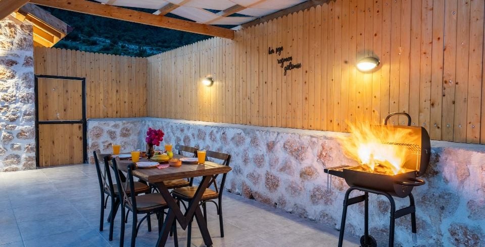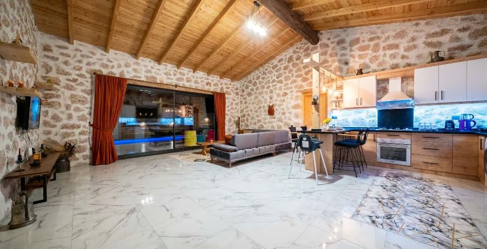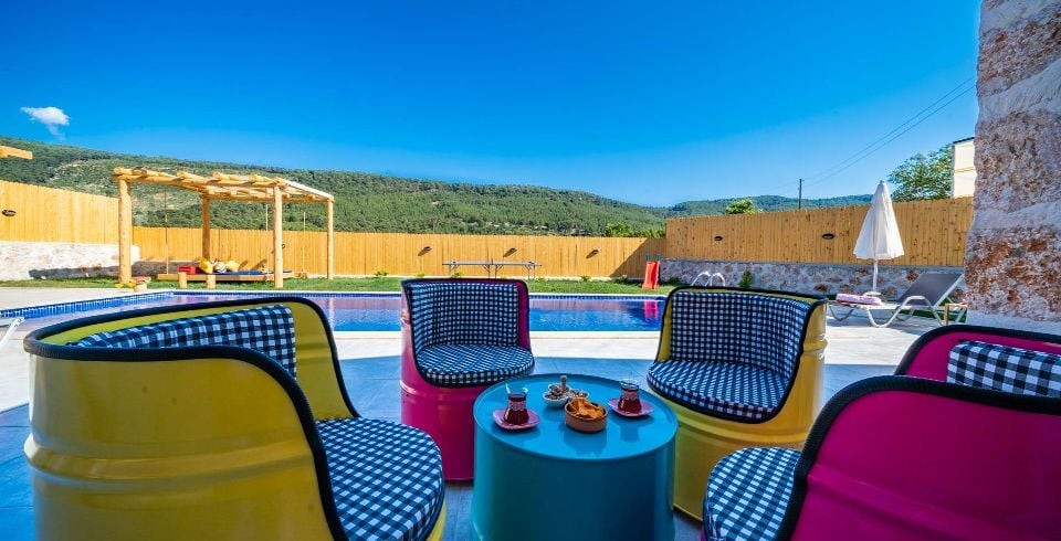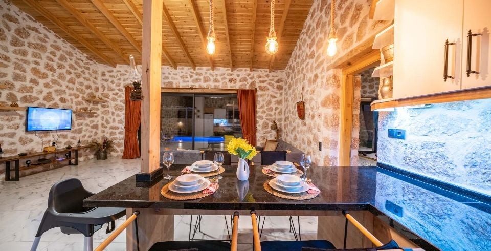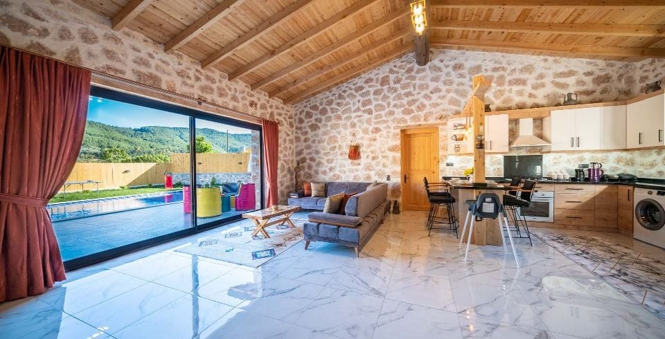 Salon: Villa salonunda konforlu oturma grubu, klima, TV, internet, uydu alıcı, yemek masası, sehpa bulunmaktadır.