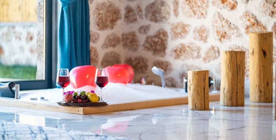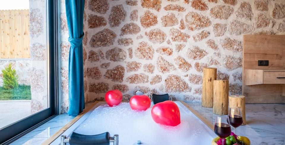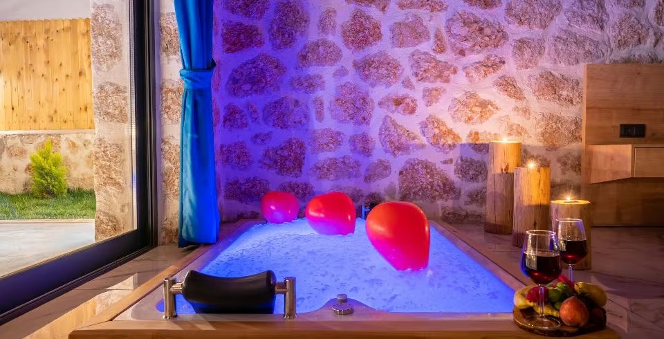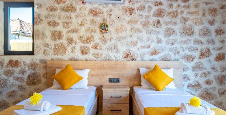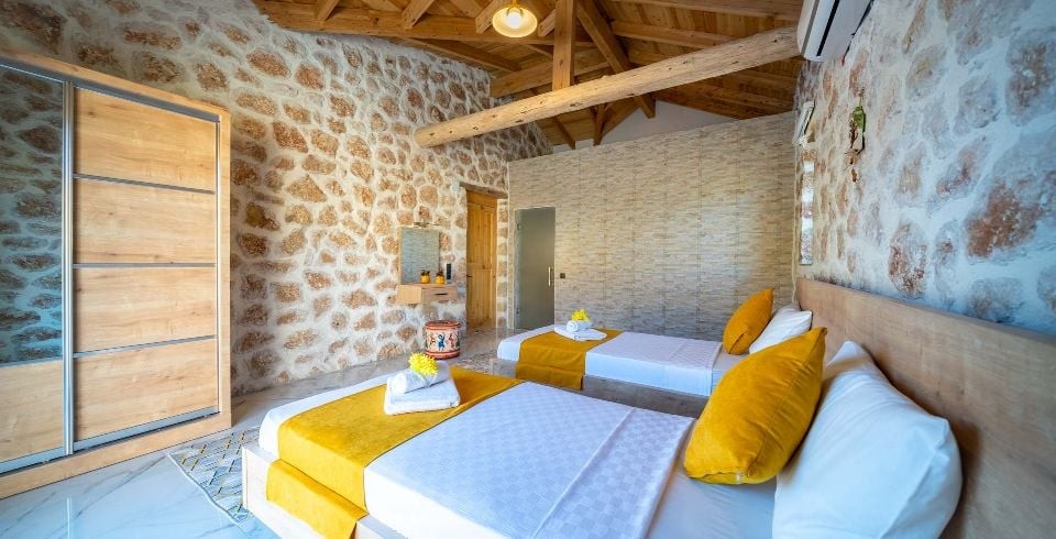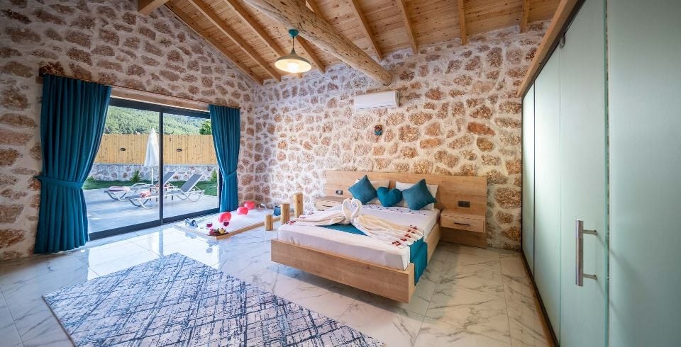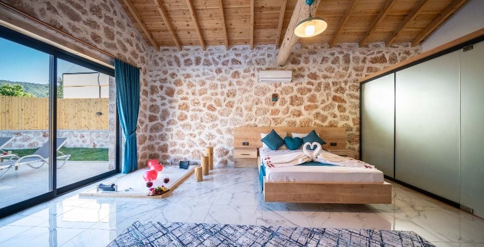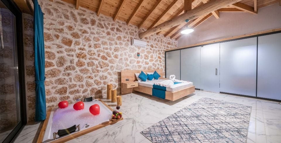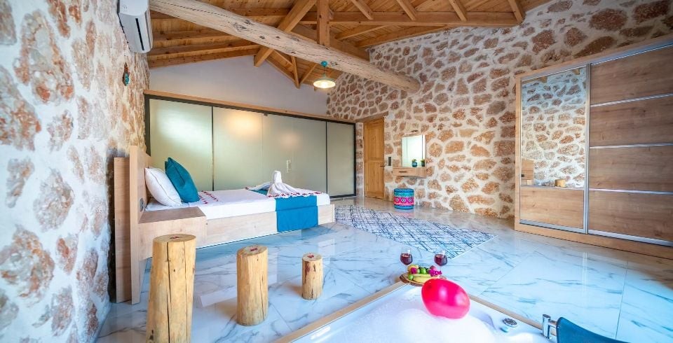 1. Yatak Odası: Çift kişilik yatak, klima, jakuzi, komodin, elbise dolabı, makyaj masası, banyo ve tuvalet bulunmaktadır.