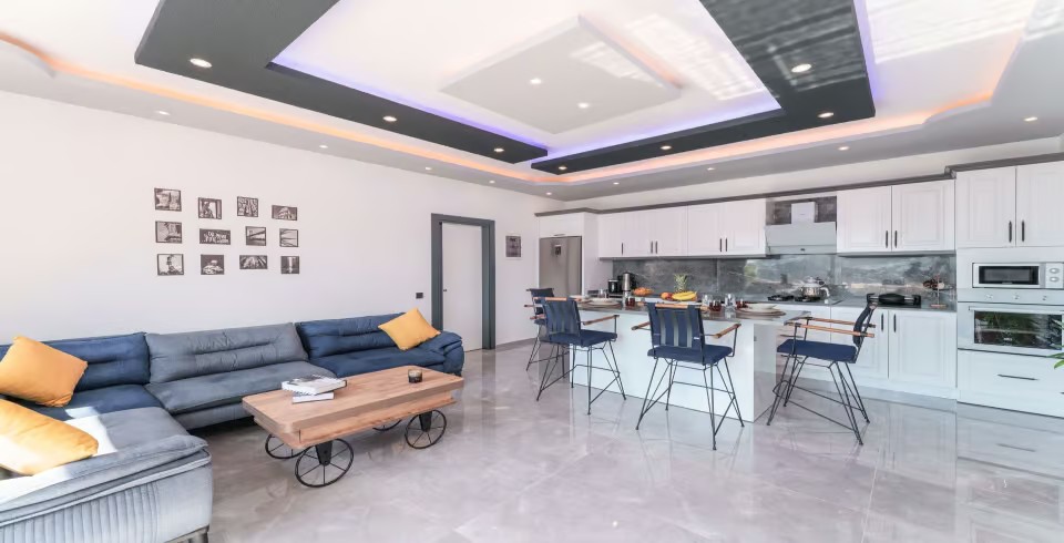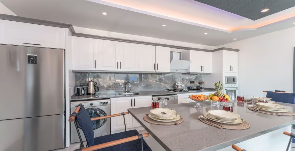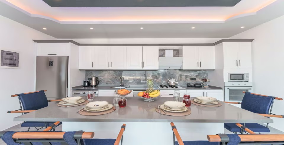 Mutfak : Amerikan açık mutfak ve salona sahip villamızın mutfağında buzdolabı, bulaşık makinası, ankastre ocak, fırın, mikrodalga, 4'lü ankastre ocak, kettle, çamaşır makinası, yemek masası ve temel mutfak araç ve gereçleri bulunmaktadır.
