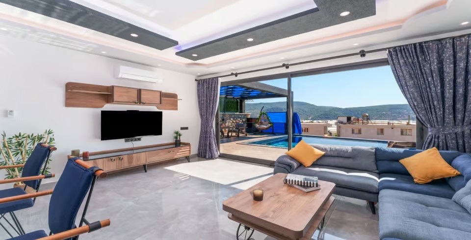 Salon : Kiralık villamızın salonunda oturma grubu, TV, uydu, internet, DVD, sehpa bulunmaktadır.