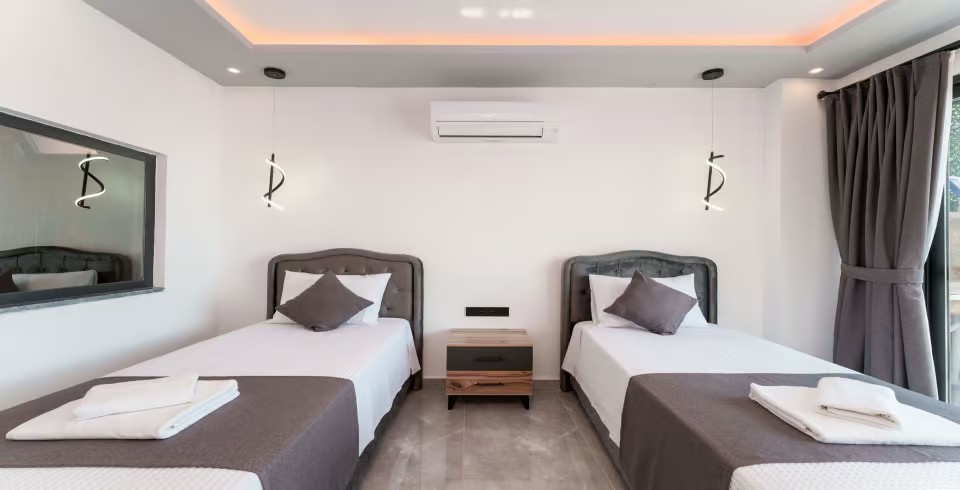 2. Yatak Odası : İki adet tek kişilik yatak, klima, elbise dolabı, makyaj masası, komodin, banyo ve WC bulunmaktadır.