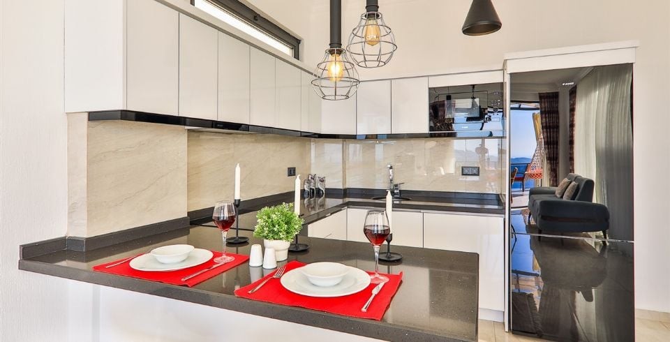 Mutfak : Şirin ve kullanışlı modern bir mutfağa sahip villamızın mutfağında buzdolabı, bulaşık makinası, su ısıtıcısı, ekmek kızarma makinası, çamaşır makinası, çaycım, mikro dalga, fırın,4'lü ankastre ocak ve mutfak araç ve gereçleri bulunmaktadır.