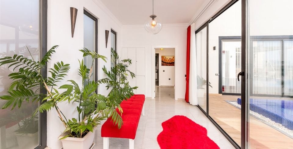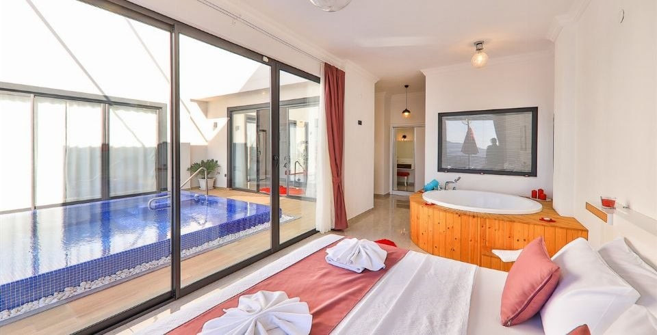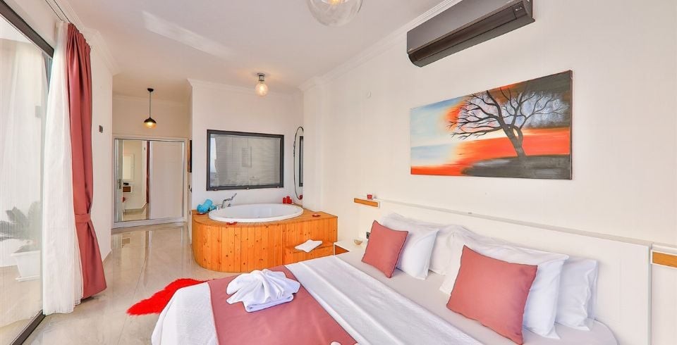 Villanın ferah yatak odasında çift kişilik yatak, klima, makyaj masası, elbise dolabı, jakuzi, banyo ve tuvalet bulunmaktadır. Ebeveyn odası doğrudan havuz terasına açılır ve güne deniz manzarası eşliğinde başlama ayrıcalığı sunar. Villanın modern salonunda konforlu oturma grubu, televizyon, sehpa ve klima yer alırken; tam donanımlı Amerikan mutfak, buzdolabı, bulaşık ve çamaşır makinesi, fırın, mikrodalga, kettle, yemek takımı, tencere ve tava gibi tüm mutfak ekipmanlarıyla donatılmıştır.