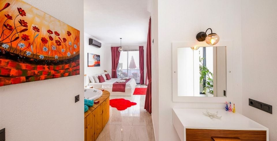 Yatak Odası : Çift kişilik yatak, komodin ,klima, makyaj masası, elbise dolabı, jakuzi, banyo ve tuvalet bulunmaktadır.